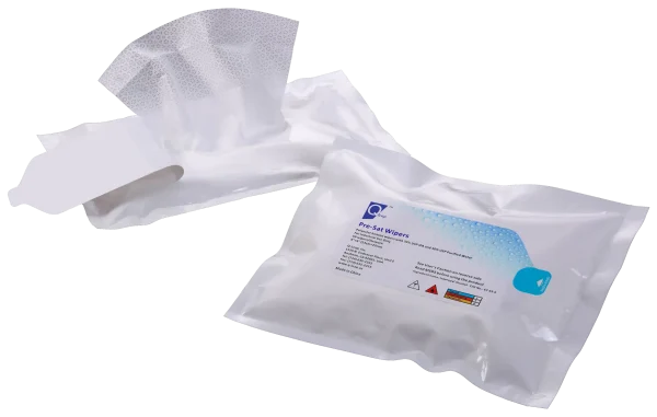 Border-Sealed Cleanroom-Laundered Wiper constructed from 100% continuous-filament polyester knit. The pre-wetted format provides a cost-effective and convenient alternative to traditional bulk solvent handling. These non-sterile, pre-saturated wipes are engineered for efficient, controlled solvent cleaning in critical areas, ensuring consistent wetting and uniform solvent delivery. Suitable for routine cleaning and maintenance in controlled and cleanroom environments.